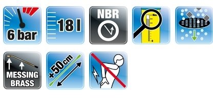 Σκανδάλη γρήγορης δράσης με μετρητή πίεσης , ορειχάλκινος αυλός ψεκασμού με κωνικό ακροφύσιο που. Επέκταση αυλού 0,5μ, πλαστική αντλία με μοχλό που φοριέται στην αριστερή ή τη δεξιά πλευρά αυτού που ψεκάζει , λουριά ώμου με σύστημα γρήγορης απελευθέρωσης, δοχείο εργονομικά προσαρμοσμένο στο περίγραμμα της πλάτης , άνετη εργονομική σκανδάλη ταχείας δράσης με μανόμετρο και με επένδυση από μαλακό υλικό. |