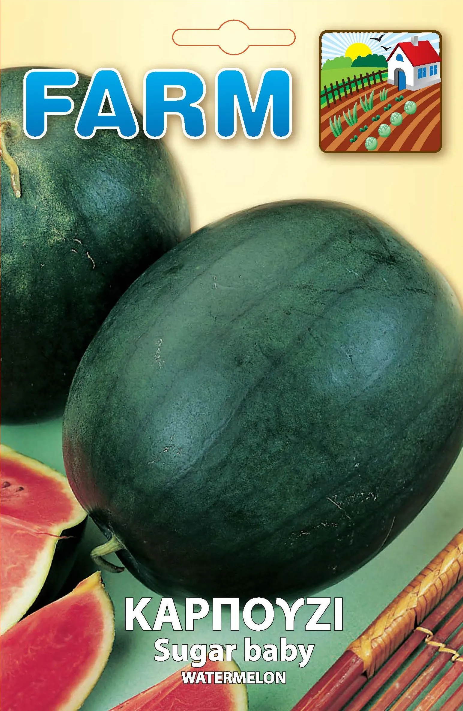 Πρώιμη ποικιλία μεσαίου μεγέθους, γνωστή για τα σφαιρικά φρούτα της και τη γλυκιά, δροσερή σάρκα έντονου κόκκινου χρώματος. Ο φλοιός είναι λεπτός, σκούρο πράσινος έως σχεδόν μαύρος, με μικρούς, ελάχιστα ορατούς σπόρους. Οι σπόροι της Sugar Baby δίνουν φυτά ζωηρής ανάπτυξης, με πλούσιο φύλλωμα και υψηλή αντοχή στις θερμοκρασιακές μεταβολές.