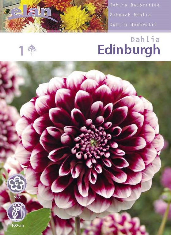 Η Ντάλια Edinburgh είναι εξαιρετικά εντυπωσιακή διακοσμητική ποικιλία ντάλιας, γνωστή για τα μεγάλα, πλήρη άνθη της και τον έντονο δίχρωμο χρωματισμό. Τα πέταλα έχουν βαθύ μπορντό χρώμα στο κέντρο, με καθαρές λευκές άκρες, δημιουργώντας έντονη αντίθεση και μοναδική αισθητική. Η Ντάλια Edinburgh ξεχωρίζει άμεσα και αποτελεί κεντρικό σημείο σε κάθε κήπο ή παρτέρι.